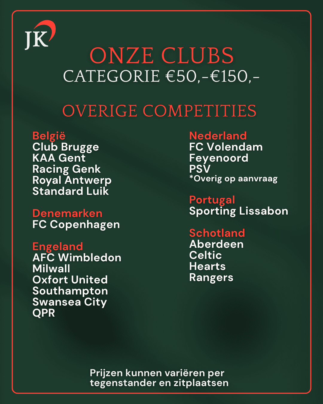 Of je nou kiest voor een los ticket om zelf de sfeer te proeven, of juist voor een luxe hospitality-arrangement met alle denkbare extra’s, JK Sport Events helpt je verder. Wij bieden toegang tot een breed scala aan wedstrijden en zorgen ervoor dat je de plek krijgt die bij jouw wensen en budget past. Denk aan plaatsen met een fantastisch zicht op het veld, of juist exclusieve business seats met toegang tot loungefaciliteiten, inclusief eten en drinken. De mogelijkheden zijn eindeloos, en wij adviseren je graag over de beste opties.